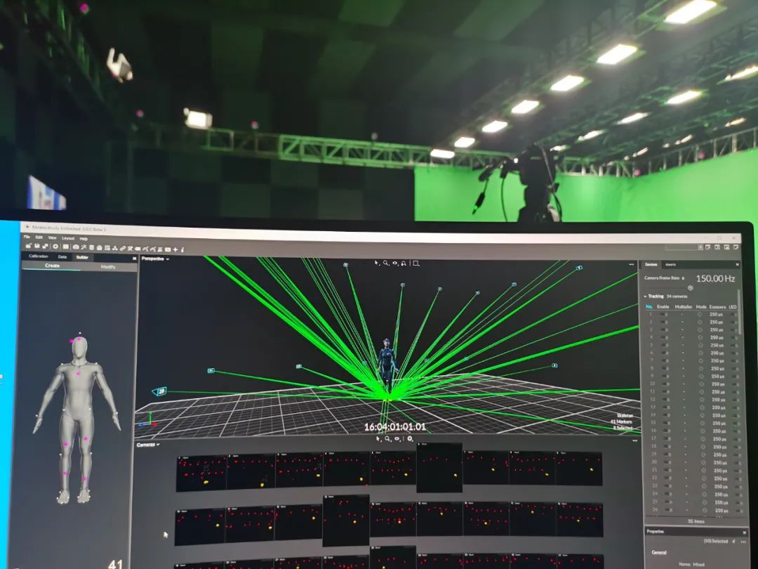 我们通过现场架设的34 台Optitrack 动捕摄像机,运用 Motive3.0 软件对动捕演员的身体动作进行识别、分析,形成骨骼数据,并将骨骼数据流传输至 Motionbuilder,实时驱动数字主持人“小漾”,为其注入活力,模拟完成主持人全部工作。同时配合节目组进行与主持人间的对位,保障动捕系统与 AR 实时渲染端系统的正常对接、现场多系统间的时码同步,确保节目顺利进行。