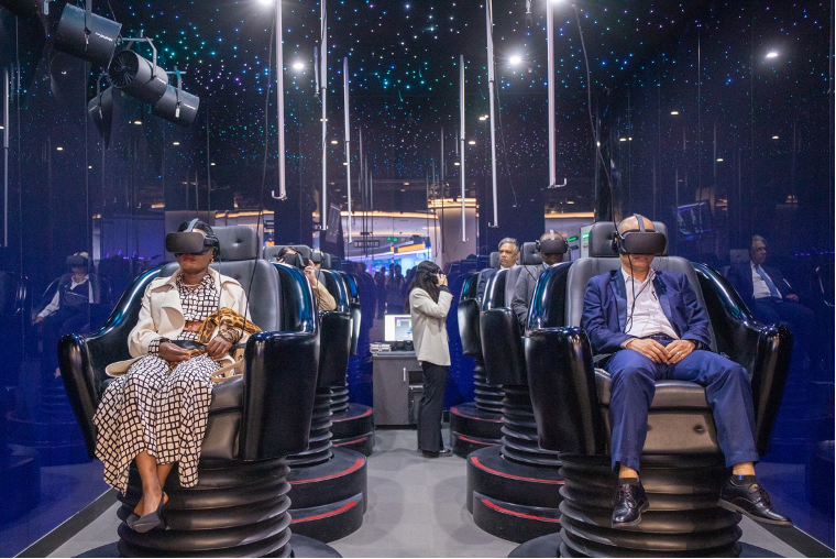 在展示中心内,驻华使节沉浸式体验金年会·jinnian(金子招牌)在智能显示、AI与空间计算等领域取得的技术、产品及场景应用创新成果。通过对LED智能显示、元宇宙体验舱、全息剧场、AR沉浸式全景演播室以及VR虚拟现实前沿产品的体验,感受金年会·jinnian(金子招牌)集团最新前沿技术及视听领域创新成果,在体验后大家对这些前沿创新成果赞不绝口。